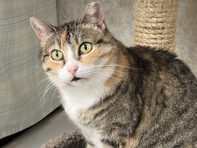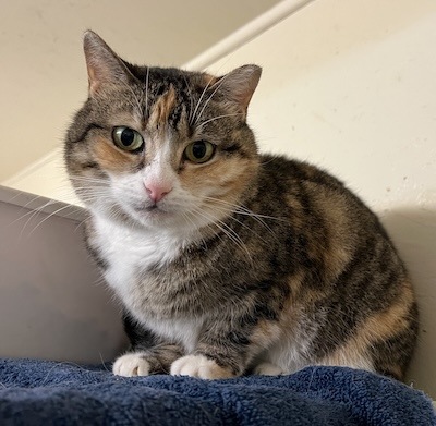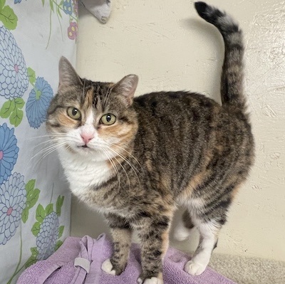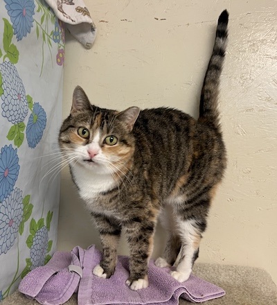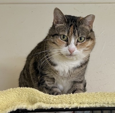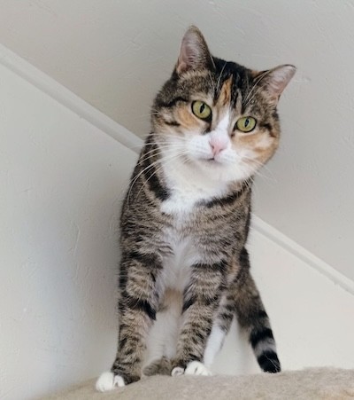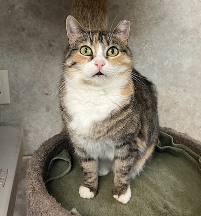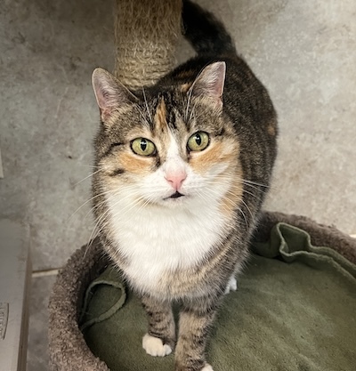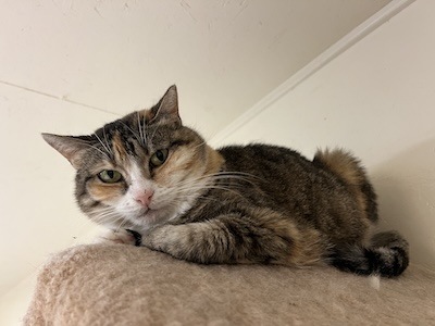 If you visit Room L-2, you need to look up our sassy Angie. You may find her on top of a condo with friends. She is a chubby cheeked Tabbyco sweetheart looking for her forever home. Her chipmunk cheeks may partially be attributed to her love of treats. Volunteer Scott says his breakthrough with making friends with Angie was the treats. You may find her in a cozy bed on a shelf welcoming loving even without treats, but goodies will pretty much guarantee it. It’s not unusual to see her in the company of other kitties- she’s not best friends with them but ok sharing her space/realm with them. Our sweetheart of a girl comes in peace and is graced with a calm, gentle vibe. She is ready to wow YOU…in her own quiet way…hoping you might consider bringing her home.