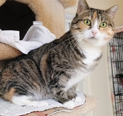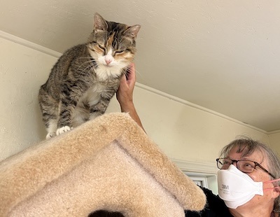 Fall 2025 Update: Picture this. We’re all familiar with Snoopy. You know, the famous beagle who was often found draped on his back on the top of his dog house. Now picture this. I’m at the very tippy top of a house positioned on a tall scratching post tree. I’m at the highest point in my room! I’m on that house, back up and belly down, legs draped over the sides. Without doubt, this is my new pose and I’m not looking to change it any time soon. For full disclosure, I kind of booted kitty Allison out of the house, where I took residence initially, but now I’m on the roof. Life is grand up here. I still have my human friend Scott stopping by to call on me. He carefully balances on a step stool so he can reach up and give me some well deserved pets. I enjoy watching the world go by from my aerie (of sorts).
