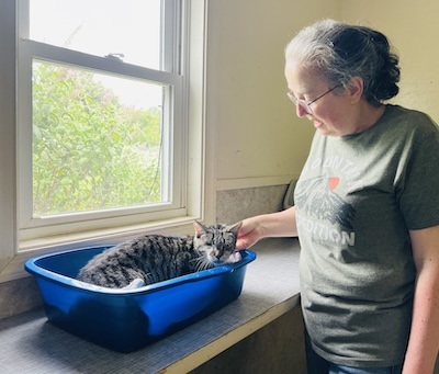 Very much a creature of habit, she’s typically found on a shelf lounging near a window. Rarely do we find her outside on the catio area, but it can happen. Slowly stroll on over and introduce yourself and let her welcome you with a soft purr and perhaps even a tiny squeak of a meow of greeting. Give her some soft strokes along her back and watch her slowly arch up in pleasure. Still a little shy and a tad reserved, she’s all heart and such a divine being. A favorite amongst some of the staff, it’s not unusual for one staff member in particular to stop by her room (before starting her morning rounds) just to check in on her “girl.”