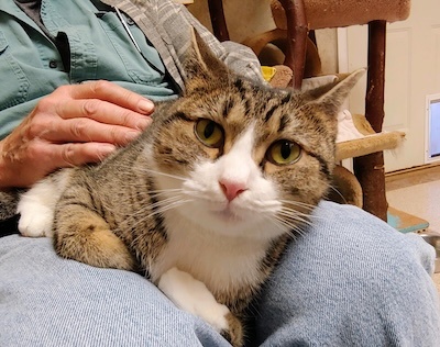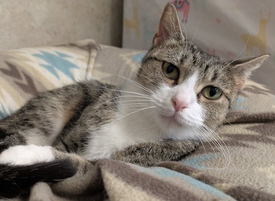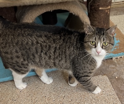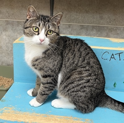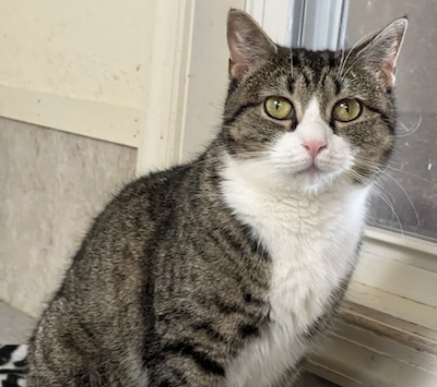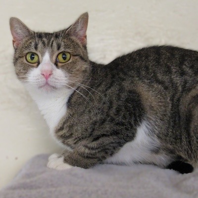 Brie is an adorable tabby and white cat with mesmerizing golden eyes who is looking for a forever home where she can settle in and share her gentle affection. Recently, Brie was moved into her new room at The Scratching Post. As with any new space, Brie is still acclimating, getting used to both the area and her fellow feline roommates.