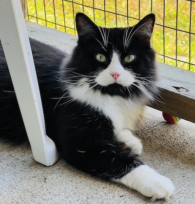 Introducing the adorable Chenille, sporting her fluffy black and white coat! Upon her arrival at CFC, she was quite shy, a common behavior observed in cats from the colony. Prior to her time here, she had minimal social interaction with humans, leading to her hesitation in trusting us and accepting affection.