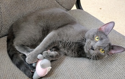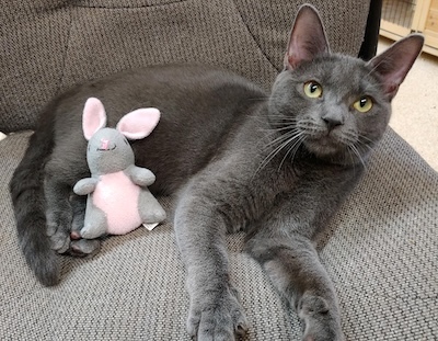 Allow us to introduce Dustin, an adorable gray kitten who joined us alongside his siblings, Mike and Will, from the colony. Although he was initially quite timid upon arrival, he quickly became more comfortable and started to interact with our staff and volunteers. He loves to be petted, although he remains somewhat hesitant about being held, as he prefers to keep his paws grounded.