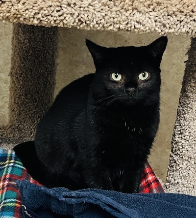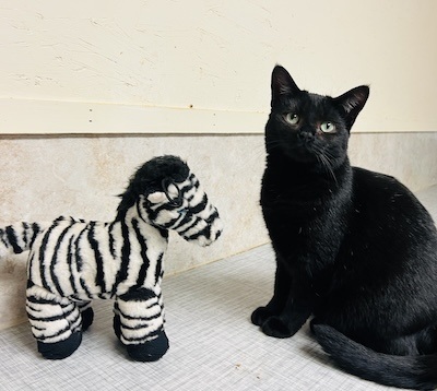 Felicia has a wonderful bond with her littermates, Farkle and Fergus. Before they were separated for spaying and neutering, they could often be found in a cozy cuddle puddle, playing together and even sharing their canned food! If you’re in search of an adorable black kitten—or perhaps even a pair—look no further than Felicia!