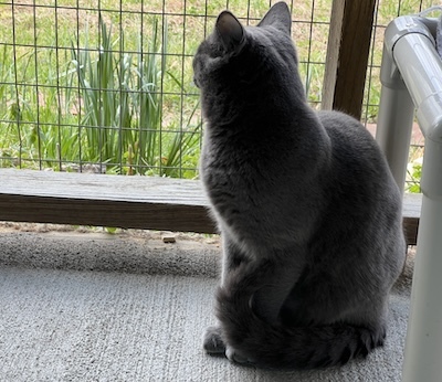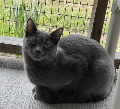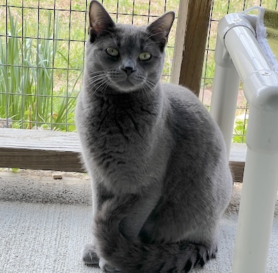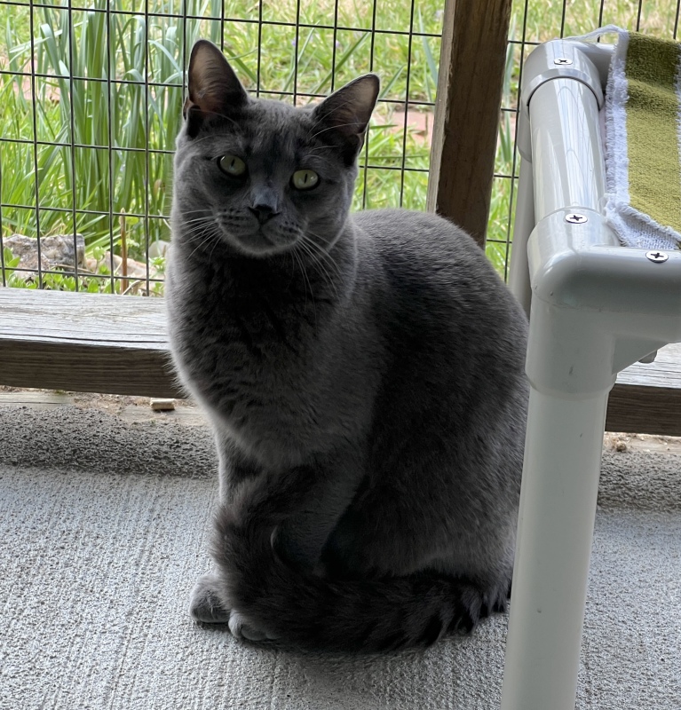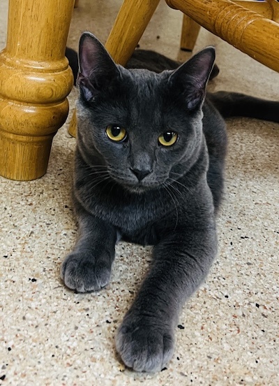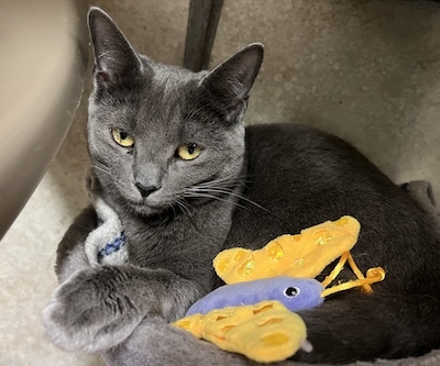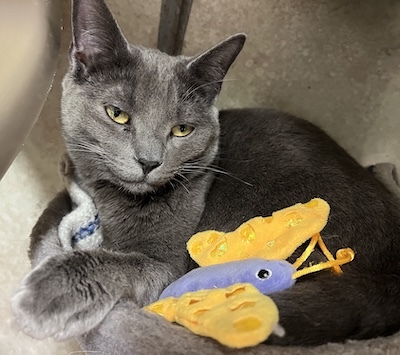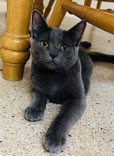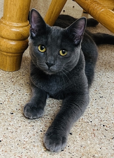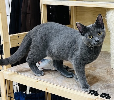 Jabari, a delightful gray kitten with enchanting golden eyes, has made his way to CFC alongside his siblings, Jaffa and Jace. Though Jabari might appear a bit reserved at first, he is indeed friendly and warms up quickly to gentle interactions. He has formed a close bond with his siblings and mingles effortlessly with the other kittens at The Scratching Post Kitchen. This popular gathering spot allows for plenty of playful interaction, as it’s typically bustling with about a dozen kittens all frolicking together.