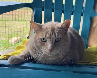 Jordan is slowly learning that he can trust people, leaning in to sniff outstretched hands. Though he does skitter away when he feels nervous of being touched. He has been such a joy to witness his slow growth towards becoming the kitty that volunteers know he can become making us hopeful that, in time, he will accept more interactions with humans in the future. He enjoys spending his time out on the catio napping and relaxing watching volunteers walking dogs, birds, rabbits, etc.! Jordan gets along well with the other cats in his area at The Scratching Post. He hasn’t shown any interest in playing with cat toys, at least while humans are around to observe.
