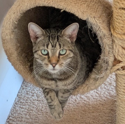 Mouse has three special attributes. His emerald green eyes are mesmerizing. His very short tabby fur is silk like and really shows off his unique tabby markings. And finally, his long legs and tail. I’ve never seen a tail on a cat as long as him. I always tell him, ” you went through the tail line twice”. As he cruises through the house, his tail drags on the floor and he looks like a tiny tiger.