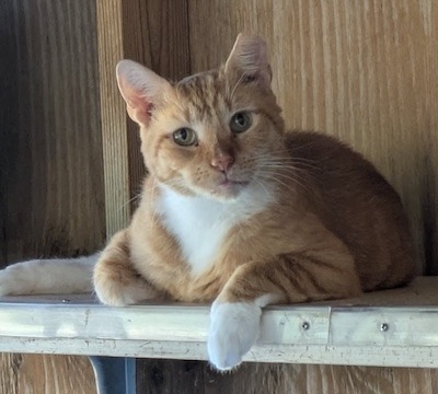 Fall Update 2025: “Ahhh. He’s my pal!” when asking volunteer Scott about our handsome orange fella MR CAT. Well, he’s really everyone’s pal and he’s doing great. Seems he’s reached an agreement with resident cat Jacque that they can both co-exist. Jacque is leaving him alone giving Mr Cat more time to be on the alert when Scott comes calling. It’s not unusual for Mr Cat to be relaxing in front of resident Binx’s condo which is right by the main door and easily accessible to those visiting the room. He’s always good for a few pets and if he keeps his tongue hanging 1/2 out (which is fairly often) making him all the more adorable, the petting/stroking session will likely last longer.