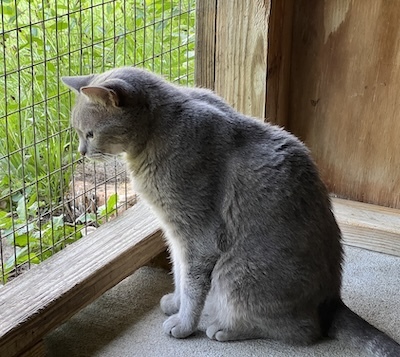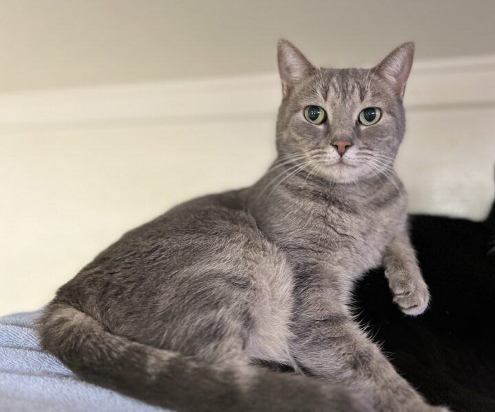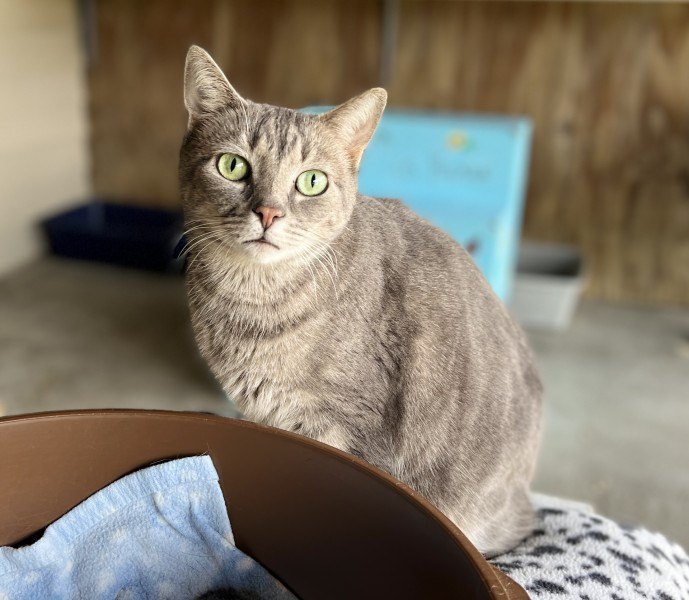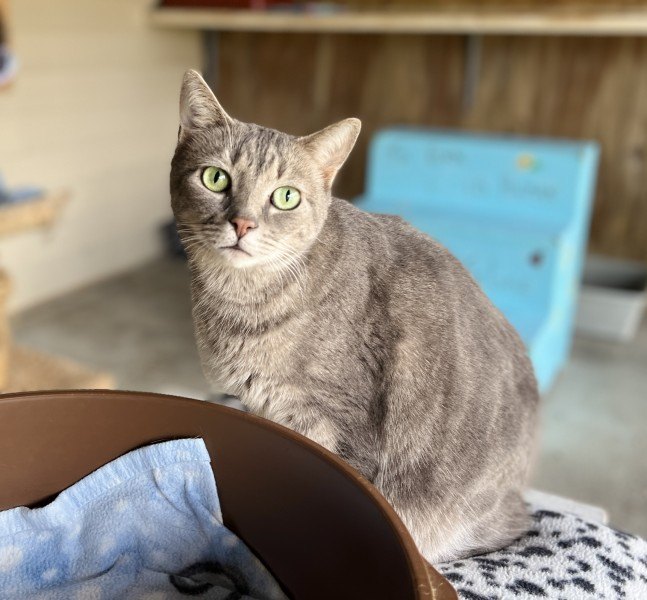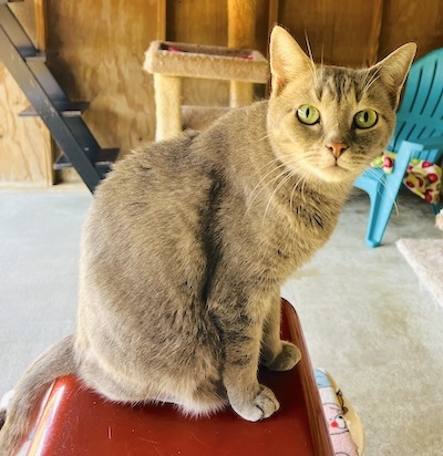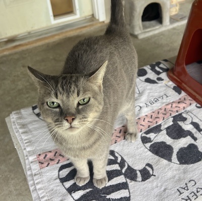 If my name makes you think of a flighty fairy like or elfin being, then I’m here to offer a correction. I’m very much an all boy cat, a likeable, feet solidly on the ground guy. I was a member of a local community cat colony until I made my way into a country store and was brought to CFC, but I’m about as far from feral as you can get. I was frightened initially, but now I’m one happy little fellow and a lover of the attention lavished on me by people. Gather me up into your lap and your reward will be soft purrs, my happy dance, and sometimes quick little kisses to your hands. Being in a lap was strange at first, but it’s become to feel more and more like home. I’m big on locking eyes with folks and while reveling in being stroked and petted I’ve been known to even drool a little bit in the sheer joy of the moment. I say, what’s a little drool among friends? It’s said that I’m beautiful outside too, with my big luminous eyes and the bull’s eye markings in my down soft silver tabby fur. You have only to see my face, brimming with goodwill and kindness, looking up at you to understand why folks here consider me such a treasure. I get along famously with all my CFC roommates and just generally have a pacifist philosophy. My volunteer friend says, “Gentleness, thy name is Sprite.” He may have been watching too many old movies, but in all modesty I think you will agree once you visit and we become friends.