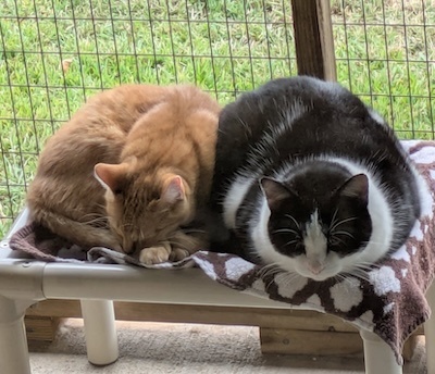 Fall Update 2025: If you see a large, poofy black cat on the top of a condo, chances are pretty good I’m hanging out with him. That’s my buddy Bandit. We’re kind of opposites in that I’m human friendly and he’s just not into humans at all! LOL. Still, we have found a common ground of friendship and it seems to just work. Most days, we are together but on occasion I break out of my daily mold and check out the patio area. If by chance my human friend Scott has stopped for his bi-weekly visitation, he knows I’m game for some pets and TLC but I won’t come to him. He must come to me. Life is good here in my room L2. I’m honestly friends with all the cats here and with the daily housekeeping and room service, we want for nothing. With my health intact, I’m set and ready to enjoy the cooler temps as we slip into this pretty fall weather. Tango
