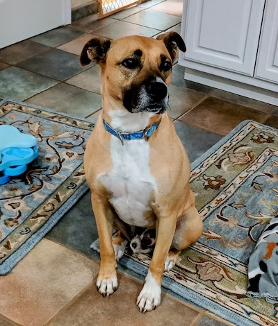 Shepherd Mix- Sleek tan coat, white tipped feet and black around his muzzle. 49lbs