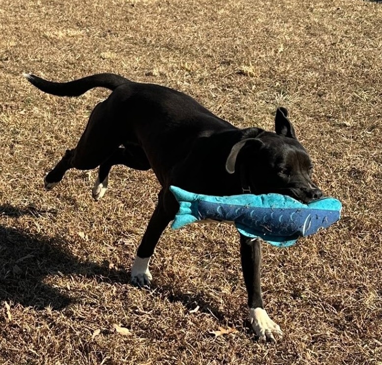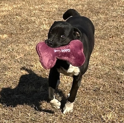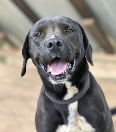 Hound/Lab Mix- Sleek black coat with a white chest blaze and white booties. About 50lbs