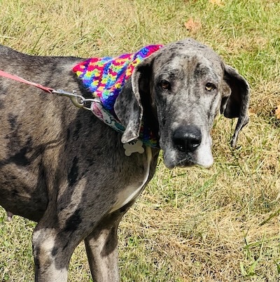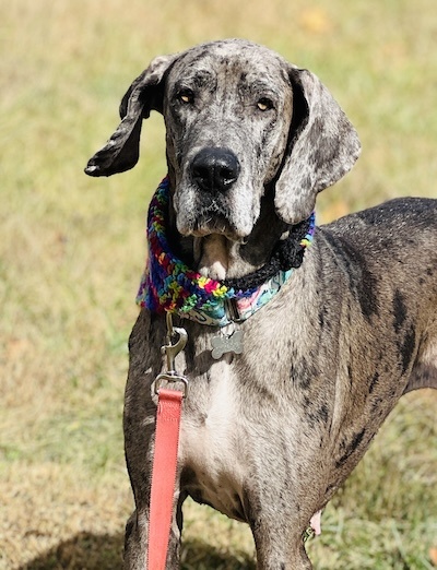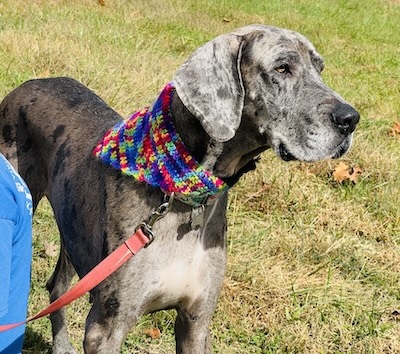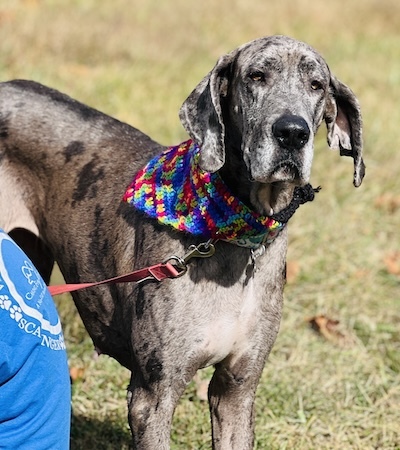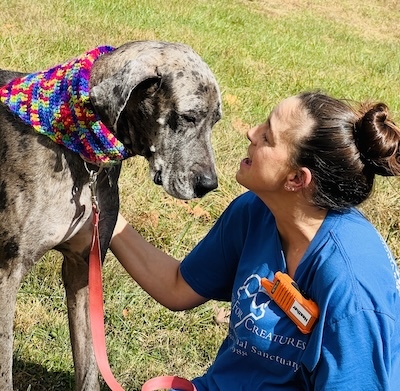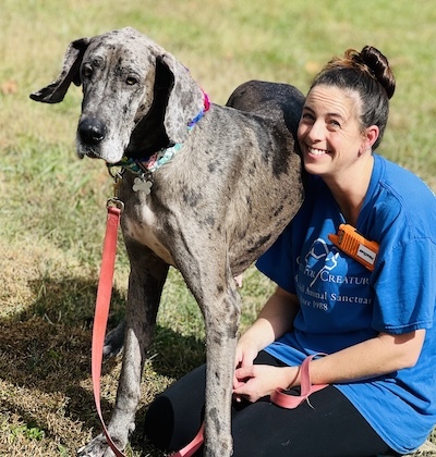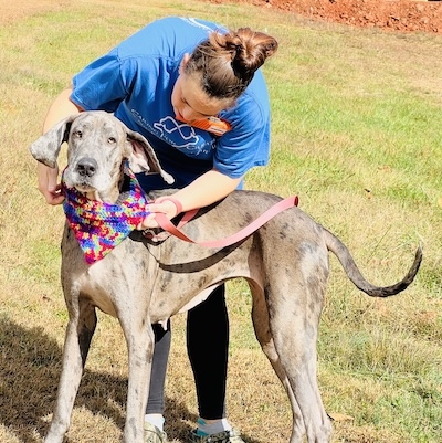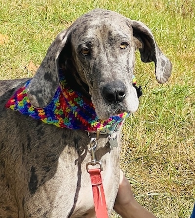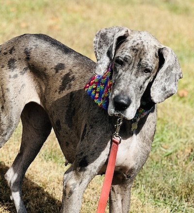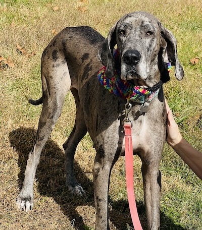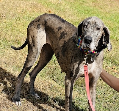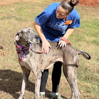 For overnights, Cora has hit the jackpot in heading home with a staff member. In the home environment, she has been outstanding. She is still not 100% housetrained but getting very close to achieving that goal. She is beautifully sharing her “foster” home with several kids (some of which are noisy!!) and she is a hit with everyone! Respectful of the home setting (no counter surfing, not destructive, no need for a crate), Cora is a good listener and if you say, “No, no!,” she gets it! She is also extremely soft mouthed, very treat motivated and sits beautifully for a snack. As her personality slowly emerges, we are learning that she can have fun bouts of “zoomies,” she loves watching the tv show NCIS and also thinks she’s an ideal lap dog… yes, 100+ lbs of her!!