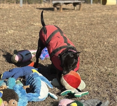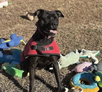 Volunteer Update Spring 2025: Darby… this girl cracked me up today. Darby had a blast playing with the toys and cooling off in the water bucket by putting her front legs and entire head in it. She even put a few toys in the water bucket. Why would she do that, one would ask? It’s because she’s Darby. I figure she thought they were dirty and needed to be cleaned, or they were hot and needed to be cooled off. Thanks for the laughs Darby!