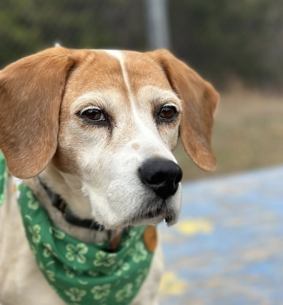 Beagle- Red and white sleek jacketed; oval red spots on her sides and freckles on her muzzle. 42 Pounds