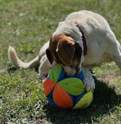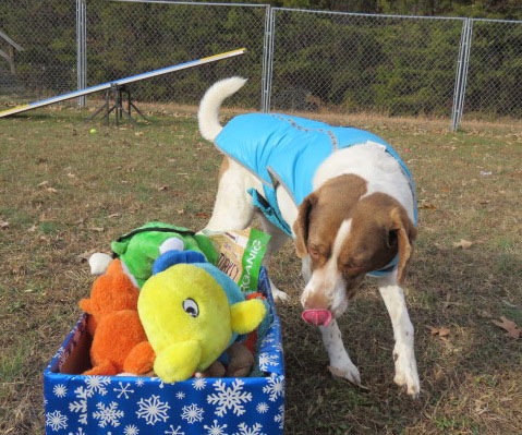 Dec 2025 Update From Trainer Wen: Recently I decided to give Olive a spa day. Mani-peti, massage, the whole shabang including cucumbers. Needless to say, the cukes were a fail. She happily tossed them off and attempted to eat them as a snack. Who wants a salad when they are expecting cookies? I then proceeded with the massage. At first Olive seemed unimpressed, however about 10 minutes in, she started to melt into the table. She was so relaxed that I thought she had fallen asleep, so I stopped. Wrong, she looked up at me as if to say I want more. After Olive had her massage, it was time for the mani-peti. I thought Olive might object, as some dogs do not appreciate their feet being handled, and many don’t like nail trims. To my surprise, and with a little moral support from her dear friend Sue Scott, Olive willingly handed me her paw. She was a proper lady for the entire process. After spa day was over, I packed her stuffed treat ball pockets with cookies for her to enjoy at her leisure.