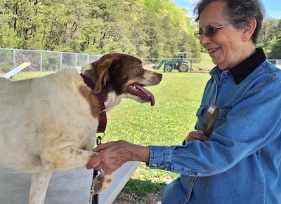Fall Update 2025: Recently dog volunteer Margaret and CFC dog trainer Wen decided to go to Valley Street in Scottsville to ask some of the local businesses if they would allow us to hang flyers promoting some of our adoptable sanctuary dogs. They decided to take Olive, one of our CFC puppers still looking for her forever home to join us. They knew she would draw attention with her stunning good looks and excellent social skills. As she approached Margaret’s car, it seemed that Olive knew that today was going to be unique. She climbed aboard and settled in for the ride. Olive’s eyes were lit up as they got closer to their destination. She quickly queued into the smells wafting from the local eateries and looked at her humans with anticipation. She would not be let down. Margaret and Wen both knew that Olive is a passionate consumer of all things food and promised her she would get her reward when their mission was completed. Olive showed excellent leash manners, and behaved like a gem. Once their mission was complete Olive was hand fed a cheeseburger for lunch and took a short walk in a field to end the day. Olive is still patiently waiting for her forever family to complete her journey.
