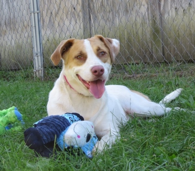 Owen gets super excited when he sees volunteers heading his way, because he knows they will take him for a walk and maybe take him to the arena. He is a jolly, happy dog who just loves to play with toys! A note of caution though; he will tear his way through stuffed toys pretty quickly, so tough toys (especially with a squeaker) are the way to go. He is treat-motivated, which always makes training much easier. He takes his treats very, very softly, and he has mastered the “sit” command. He can be strong out of the gate, raring to go, but once he burns off the excess energy, he’s a model walker. When Owen is running out in the arena, he is a beautiful sight! He can get very excited meeting other dogs, and he hasn’t quite mastered the art of politely introducing himself to them, but that is something that can be worked on through training. Owen has a have limited range of motion in his left hip likely due to an untreated older injury. He is on medication for pain off and on. Owen runs and plays like any normal, happy dog and the limited range of motion in his hip does not slow him down…at all!
