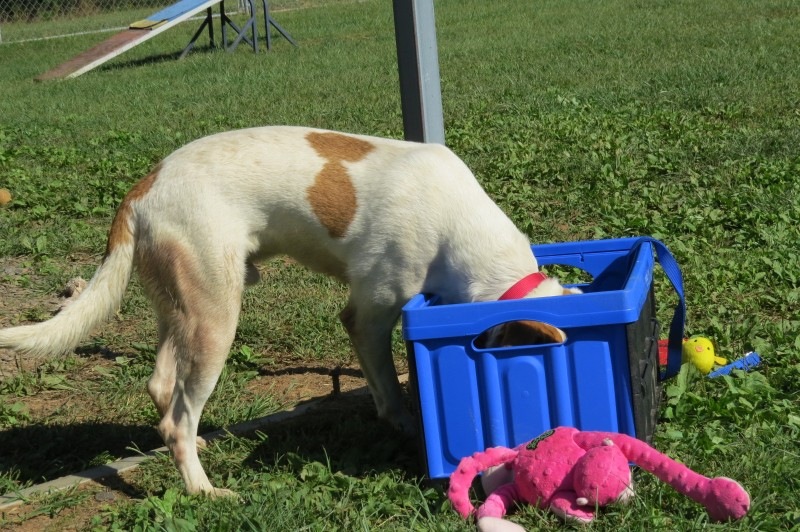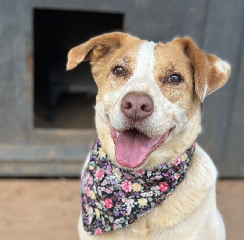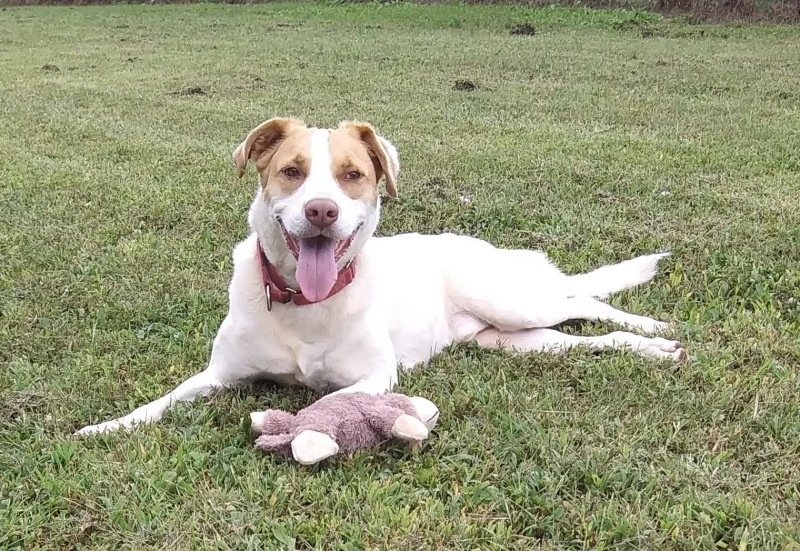 Update Fall 2024: Owen continues to love his stuffed toys, and is still a very sweet and happy guy. He has mastered how to get into the toy box in the arena so he can pick just the right one. Very keen. One of his favorite toys right now is a Kong Jumbler. Recently, we discovered a new hidden talent. Approx 1 month ago, Owen began barking at his dog house and avoiding going in it. All of us here at CFC, investigated what could be the cause to no avail. Several days later we saw a large black snake exiting from underneath his house. Although we could not find anything there previously, Owen knew there was an unwelcome visitor in his enclosure. Perhaps this guy has a future as a snake detector. Owen continues to enjoy a good dig. He has graduated from small holes to rather large ones. He really likes when we cover them up, so he can immediately begin to excavate them. I think in his new forever home he would like his own digging/sand box. Owen is a gentle guy since the day we met and happily welcomes new people into his life.