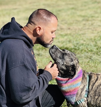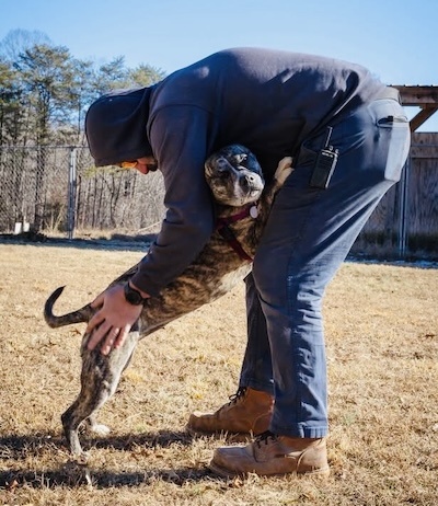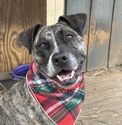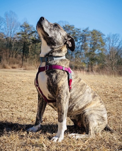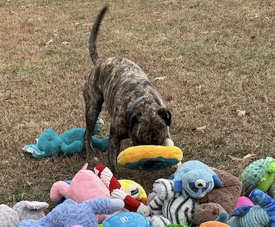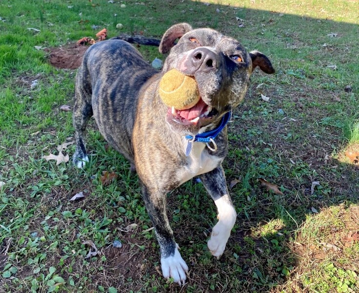Bully Mix- Brindle with white boots and blaze on chest. 60lbs