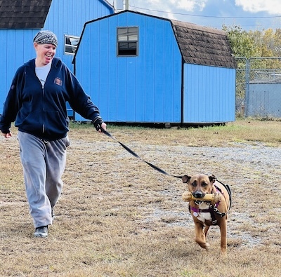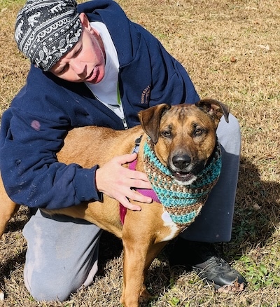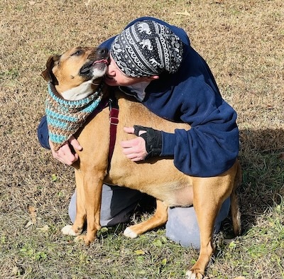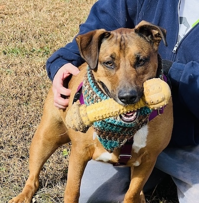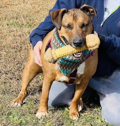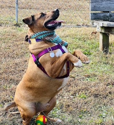 More about me Jan 2026 from Trainer Wen: Simon AKA Linus is quite the character. When he goes for walks, prized bone in mouth, his body wiggles uncontrollably with happiness. He sachets, and prances, while telling all about his joy. He makes the cutest vocalizations, which are muffled because he is literally talking with his mouth full. He likes to converse with his dog neighbors as well. He and Lana trash talk to each other. In his defense she started it. Simon can be heard by all as he announces his presence. Yes this guy is talking while walking. Seems he wants all to know his joy and elation when he is with his people. Simon really craves attention and has no problem telling you so. He will sing to you then cling to you. No matter where Simon is, or what he is doing, his bone is always with him. (Most often it is in his mouth) Simon thinks he is a lap dog, and will happily sit on you for some snuggles. But buyer beware! Hims may fart on you on occasion and will happily stay with you for a lengthy snooze. He also really likes to hold hands/paws. I think he just doesn’t want to let you go, or for you to leave him. He is such a sweet dog and truly loves his people that much. Simon likes to play fetch and sometimes doesn’t let you have the ball back unless you have another for trade. Simon is good with kids and has lived with other dogs before in his previous home. Simon is also house trained. This dog has a huge personality and is full of love with a little goofball mixed in. He also is a big fan of karaoke.