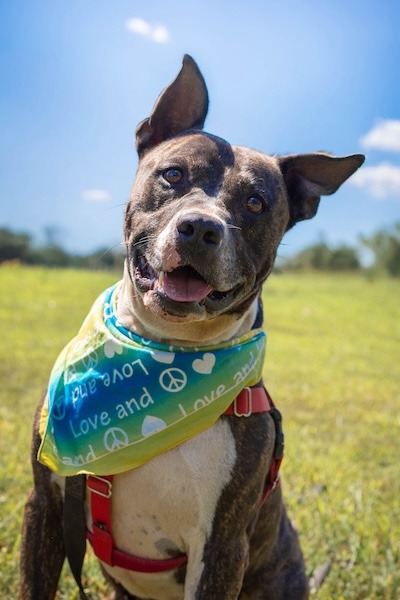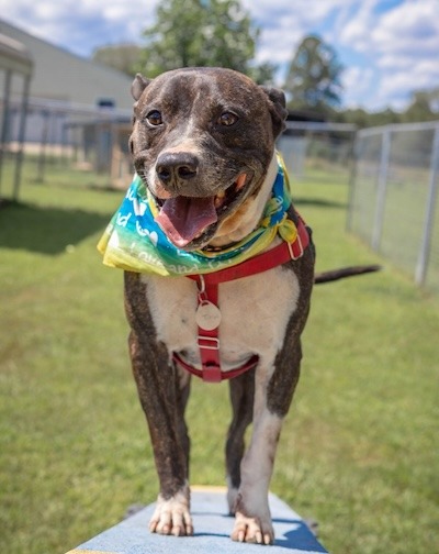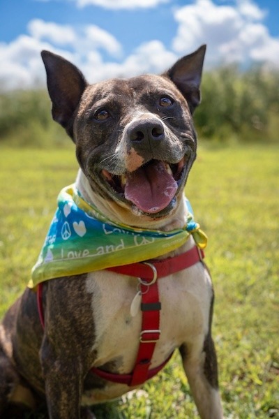More about me Sept 2025: This gorgeous brindle-and-white bully mix is all muscle on the outside and pure squish on the inside! His ears? Absolute perfection—one folds back while the other does its own thing, and it’s the absolute cutest.
