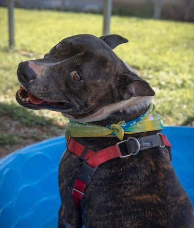 About 6 yrs old, Titan is very friendly, welcoming and yes, he kisses on the first date. A curious, athletic fella, Titan is very much a people person and truly loves pleasing us! He is terrific at sitting for a treat and can be very focused. He really loves his snacks! A deep nuzzler and hoping to egg you on for even more pets and body rubs, Titan has the most endearing, goofy smile that we think you’ll agree will be hard to ignore. Plan on taking a seat when you meet our amiable brindle boy and expect to best friends asap. Graced with a goofy, playful vibe, Titan is curious about his surroundings and has been fast to check out our play yards, discovering a plethora of plenty smells but showing little or no interest (thus far) in activating/playing with toys. Titan has a big, very loving feel to him and he always leaves a big smile on our faces.